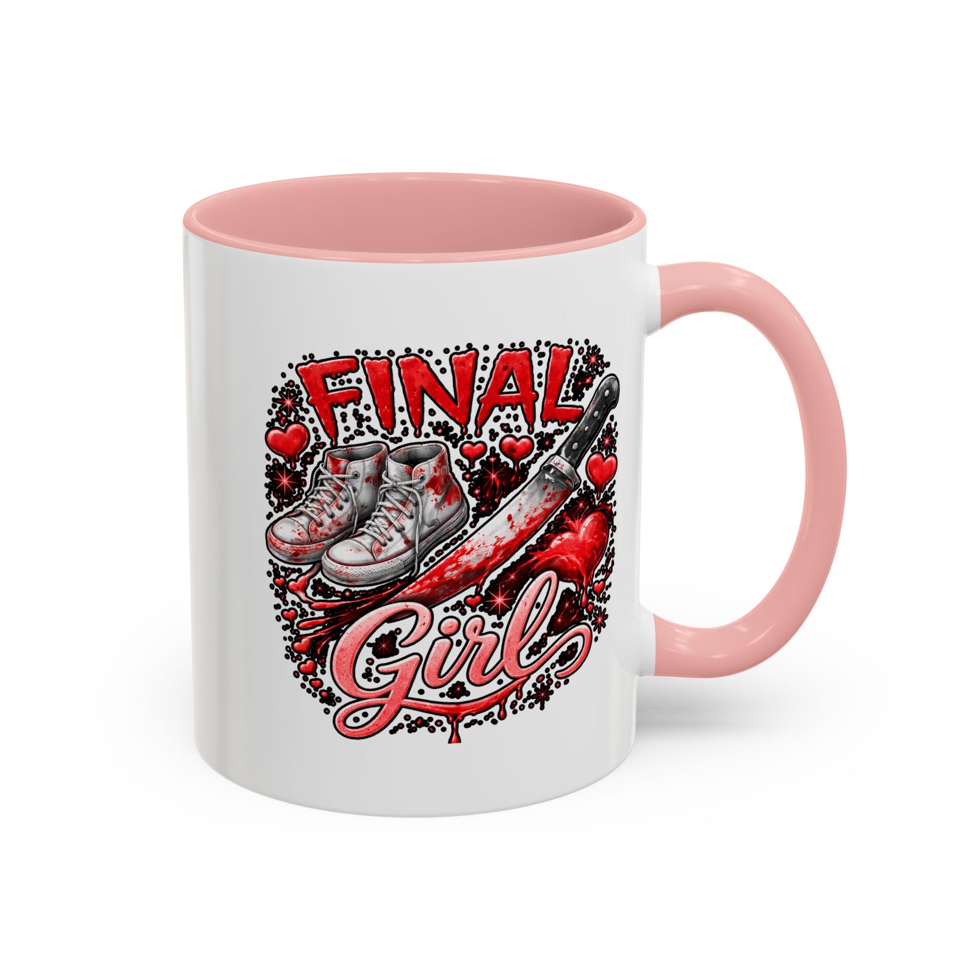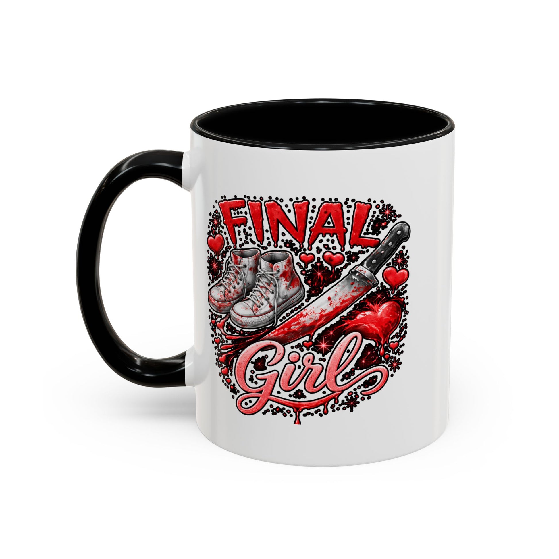 This glossy ceramic mug brings attitude to every morning ritual. Bold red and black artwork wraps around the white ceramic, featuring sketched high-top sneakers, a scuffed bat, dripping hearts, and the hand-lettered phrase “Final Girl.” It reads like a mini poster — edgy, nostalgic, and a little dangerous — for someone who loves cult horror, retro punk style, and cinematic femme‑warrior energy. The colored interior and handle add a striking contrast that makes the design pop in the sink or on the desk. Use it for coffee, tea, or as a display piece on a shelf among vinyl, zines, and VHS-era decor. It’s made to withstand everyday use while keeping that hand-drawn intensity bright and sharp.